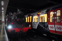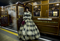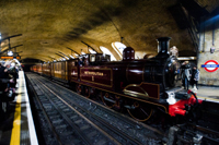 隨著夜色中的一聲汽笛,一輛19世紀(jì)蒸汽機(jī)車?yán)S多利亞時(shí)代的木制車廂駛?cè)雮惗氐罔F穆?tīng)柹w特車站,白色蒸汽從紅色車頭上冒出來(lái),煤氣味在空中彌漫,這一幕似乎把人們帶回到了1863年。那一年1月9日,倫敦開(kāi)通了世上第一條地鐵線路。