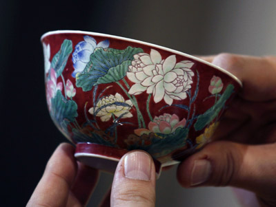 香港2013春拍上一件清康熙御制胭脂紅地琺瑯彩蓮花圖碗經(jīng)11口叫價以7400萬港元成交(約合950萬美元),刷新清康熙瓷器拍賣紀(jì)錄。