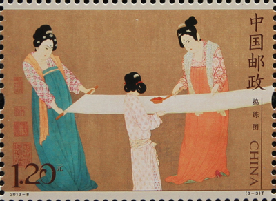 當日,由中國郵政發(fā)行的唐代名畫《搗練圖》特種郵票一套三枚及小型張一枚在全國正式發(fā)行,總面值9.60元。該套郵票以原畫作品為藍本,由中國著名郵票設(shè)計師王虎鳴擔綱設(shè)計,以簡約明快的表現(xiàn)手法突出了古畫的韻味。小型張采用扁長票幅,邊飾古香古色,在方寸間充分表現(xiàn)了原畫的神韻。