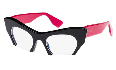 這個(gè)概念系列表現(xiàn)在材質(zhì)上,經(jīng)由粗寬線條的鏡架塑成了四種材質(zhì)性:其中一款為2013春夏服裝秀中曝光的傳統(tǒng)塑料材質(zhì),另外兩款為醋酸纖維材質(zhì)以及一款金屬材質(zhì)。這個(gè)新眼鏡系列是以中性的黑白色系和ibisco-coloured的鏡架呈現(xiàn),其他也有tartaruga,