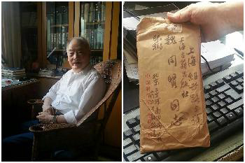左圖為2013年6月5日,原上海古籍出版社社長魏同賢在家中。右圖為魏同賢展示的錢鐘書先生當年寫給他的書信信封。張家珍/攝