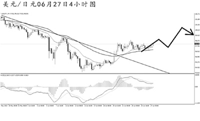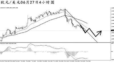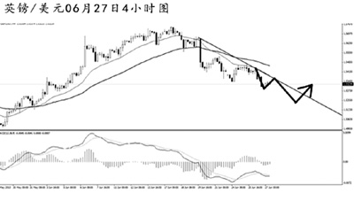 歐元兌美元最近6個交易日5天收陰線,體現(xiàn)出強勁的下行勢頭。4小時圖均線系統(tǒng)已經(jīng)形成空頭排列,且同時受到下降趨勢線的壓制作用。道氏高點阻力在1.3150,升破此位置之前,歐元的跌勢料將延續(xù)。短線可看出明顯的空頭動能減弱的信號,預計歐元將展開一波上調(diào),但下行的趨勢不易改變。