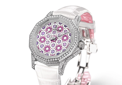 71顆粉紅色藍(lán)寶石(約0.23卡)丶14顆紫色藍(lán)寶石(約0.05卡)及73顆鉆石(約0.21卡),重塑表面的花卉圖案,并透過(guò)表底剔透的藍(lán)寶石水晶玻璃,綻放閃爍光彩。表背外圍的白金制部分飾有人手雕花圖案,令精致的花瓣和花冠更加突出,設(shè)計(jì)主題更加活靈活現(xiàn)。