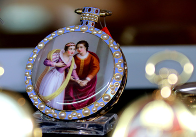 這是在日內(nèi)瓦佳士得秋季拍賣香港預(yù)展上展出的一塊1820年制作的18K金琺瑯鑲珍珠懷表,估價(jià)為9.5-15萬美元。