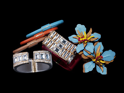 設(shè)計(jì)靈感來(lái)源于上世紀(jì)四十年代高級(jí)珠寶的創(chuàng)意和誘人魅力,Prada推出了一系列頗具現(xiàn)代感的珠寶,包括手環(huán)、手鐲、手鏈和耳飾。