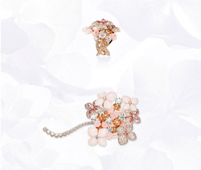 純凈白色的色調(diào)之中暈染一抹象征剛萌芽情懷的粉嫩色調(diào),寶石變成為一朵朵花卉,當(dāng)繡球花展開(kāi),便成為無(wú)數(shù)由粉紅碧璽組成的花朵,玫瑰金上是精雕細(xì)琢而成的蛋形蛋白石和粉紅色藍(lán)寶石。純凈的美鉆巧妙地結(jié)合彩色寶石,展示珍貴寶石的浪漫一面:一枚盛開(kāi)著的繡球花戒指,一枚仿如隨風(fēng)搖動(dòng)的胸針,一枚優(yōu)雅精致的神秘腕表,或一條可轉(zhuǎn)化成短項(xiàng)鏈和手鏈的多功能長(zhǎng)項(xiàng)鏈。