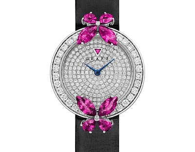 這枚26毫米女裝腕表有兩個(gè)獨(dú)特的款式可供選擇,一款在12時(shí)和6時(shí)位置也鑲有鉆石蝴蝶,另一款則在6時(shí)位置鑲有蝴蝶。這一枚優(yōu)雅的腕表配以黑色緞面表帶,限量300枚。