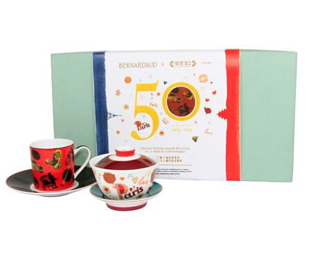 2014年,是中華人民共和國與法國建交五十周年,以「巧手」為年度主題的福茗堂茶莊與法國頂級(jí)瓷器品牌里摩日(Limoges)的栢圖(Bernardaud),攜手合作設(shè)計(jì)了一對(duì)限量1,964件,融合兩國國飲文化的中國蓋碗茶盅與法國咖啡杯。作為對(duì)法國遺產(chǎn)做出卓越貢獻(xiàn),同時(shí)也是法國精品行業(yè)聯(lián)合會(huì)ComiteColbert七十個(gè)尊貴成員之列的法國頂級(jí)瓷器品牌栢圖,