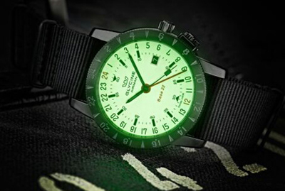 22 MYSTERY “LUMINOUS”表款完全依循Glycine傳統(tǒng):24小時(shí)制,同時(shí)搭載三地時(shí)間與紅色GMT指針。