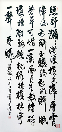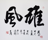 闞宇清,號古清,一九三八年生于沈陽,家世從商而重文,幼讀私塾學(xué)啟蒙之文,書法柳公權(quán),中年改臨羲獻(xiàn)、蘇米、王鐸,讀帖臨池至老不輟。生性喜游,數(shù)十年間國內(nèi)外行四十余萬里,博覽古今勝跡,摩崖石刻,謁訪名家,切磋書藝,故書中有柳之筋骨,蘇之豐潤,王鐸米芾之豪宕不羈;尤善作榜書,結(jié)體嚴(yán)謹(jǐn)、雅俗共賞,省內(nèi)寺廟匾聯(lián)、高速公路站名、商業(yè)牌匾多用其書,所參加國內(nèi)外書法大賽,皆得入選或獲獎;其作品在美、日、港、臺展出并被收藏。