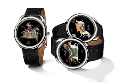 每個(gè)表盤(pán)隨后組裝在Arceau系列的白金表殼內(nèi),并搭載愛(ài)馬仕自制H1837自動(dòng)上煉機(jī)芯。這群形態(tài)優(yōu)美秀麗的駿馬,披上波斯毛氈馬鞍,威風(fēng)凜凜,護(hù)送愛(ài)馬仕對(duì)美術(shù)工藝和馬術(shù)世界的不息熱忱,并駕齊驅(qū)。