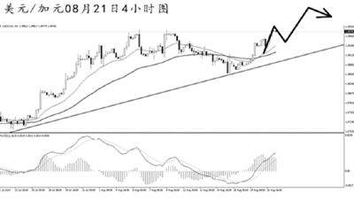 美元兌加元短線發(fā)起上攻。從4小時圖上看,MACD已經(jīng)進入到多頭動能充盈的階段,均線系統(tǒng)重新形成向上的排列,匯價繼續(xù)上攻的概率偏大。短線面臨一定的下行壓力,但仍可保持看漲的思路。