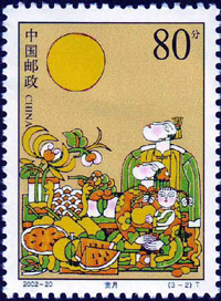2002年9月21日,為慶賀“天上人間共團(tuán)圓”的中秋節(jié),中國郵政發(fā)行了主題為《中秋節(jié)》特種郵票一套3枚。