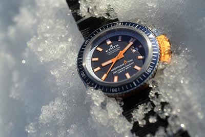 Sub令人驚艷的500米防水來自于在表冠上創(chuàng)新的加入鎖緊防水圈及避震防水圈;而能成為陪伴Redl冰下潛水的重要關鍵是裝置獨特可滑動的表冠保護蓋確保腕表在極度寒冷的環(huán)境下仍能順利運作。這只Hydro