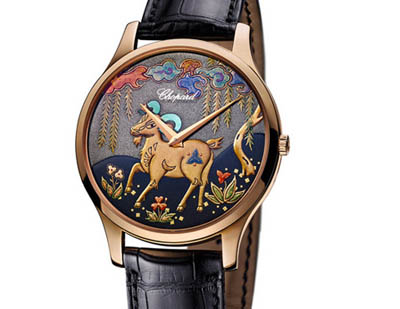 XP腕表。十二生肖中藝術性最高的山羊造型在面盤上精致呈現(xiàn),表殼內更搭載蕭邦自制的L.U.C超薄機芯。