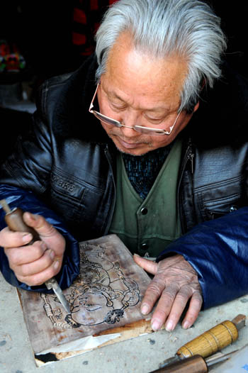 河南開封朱仙鎮(zhèn)木版年畫老藝人張連生在手工刻制年畫印版。 |