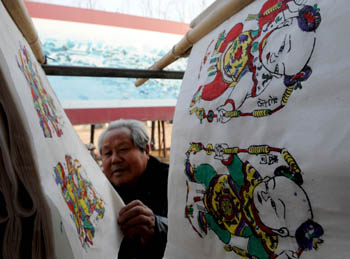 老藝人在晾曬制作的年畫。本版照片均由記者朱祥攝 |
