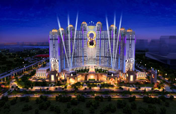 而度假村外觀最引人眼球的恐怕就是位于兩棟酒店中間頂樓的摩天輪!8字形”的摩天輪外觀有如圓滾滾的葫蘆,分外可愛。這個摩天輪更有一個閃亮的名字——“影匯之星”,它飽含著何猷龍打造澳門新地標(biāo)的希望。摩天輪靈感源自“蝙蝠俠”系列影片中“葛咸城”大樓上的探照燈,8則是中國的吉祥數(shù)字,寓意“財源廣進(jìn)”。這座摩天輪有130米高,建成后會是亞洲最高的摩天輪。
