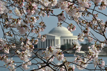 1935年,華盛頓舉辦第一屆“櫻花節(jié)”。四年后,羅斯福總統(tǒng)在遍植櫻樹的潮汐湖南岸,為美國(guó)開國(guó)元?jiǎng)诇R斯·杰弗遜紀(jì)念堂奠基。這座與華盛頓紀(jì)念碑、白宮、國(guó)會(huì)大廈和林肯紀(jì)念堂齊名的建筑,當(dāng)時(shí)也是爭(zhēng)議不斷,其一就是櫻樹。因建筑占地近八萬平方米,需砍掉一些老榆樹和櫻花樹。許多美國(guó)婦女將自己綁在櫻樹上,發(fā)誓與樹共存亡。她們當(dāng)算是拆遷釘子戶的老祖母。最后雙方各讓一步,政府承諾在紀(jì)念堂完工后廣植櫻樹。