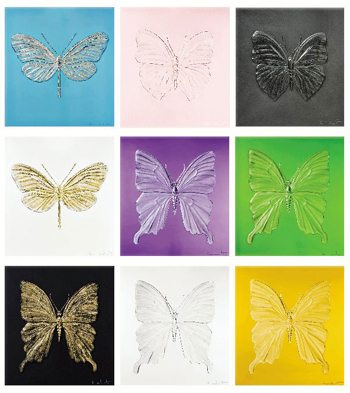 達米恩·赫斯特:我視蝴蝶為靈魂,也是廣泛被使用的世界視覺語言。我經常形容蝴蝶是宇宙的啟發(fā)者,每一個人都會愛上它那不可思議的脆弱美態(tài)。對我來說,蝴蝶另一個吸引的元素,就是那種介乎于生日賀卡上被大眾喜愛的形象、愛的力量,以及昆蟲本身真實存在的矛盾張力。我們往往嘗試利用自然來表達一些難以言傳的意念:愛、欲望、信念和永恒,蝴蝶正好是一個有趣的例子。其實這些都是既定的意念,基督教便經常利用蝴蝶來表現(xiàn)復活;古希臘用來代表靈魂。我最喜愛蝴蝶無論生前死后都是一模一樣,但當光線穿透這些版畫時,它們就像以另一種形態(tài)復活了。