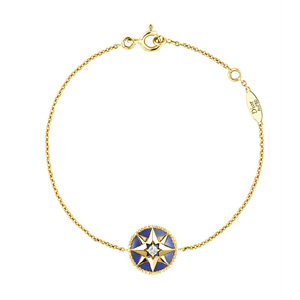 Vents(羅盤玫瑰)系列正是基于這些故事的靈感之作!拔易畛踉O(shè)想的是一枚小小的圖案吊墜,后來我覺得設(shè)計成圓形圖案的徽章樣式更具紀念意義!边@位迪奧高級珠寶部藝術(shù)總監(jiān)如是說!八笳髀眯,其中蘊含著克里斯汀·迪奧的星星和那段幸運符的故事,同時包含了迪奧先生最愛的玫瑰花元素。品牌的歷史精髓都隱含在其中!庇牲S金和珍珠母貝、青金石或綠松石、玫瑰金和粉色蛋白石精心打造,這些美輪美奐的珠寶仿佛在輕訴品牌的傳奇故事。圓形徽章圖案周圍飾有一圈金色稻穗,旨在向帆纜和大海致敬。吊墜一面為寶石,一面為羅盤玫瑰圖案,正反面隨著佩戴者的舉手投足交替顯現(xiàn)。圍繞同主題打造的手鏈和長短款項鏈,大大豐富了這一系列的選擇!癛ose