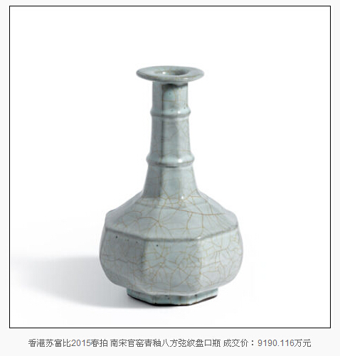 2015年已經(jīng)過半,藝術(shù)市場上各大拍行春拍也相繼收槌。瓷器板塊,香港蘇富比春拍一件南宋官窯青釉八方弦紋盤口瓶以1億1388萬港元(約合9190萬人民幣)的成交價占據(jù)2015上半年的排行榜頭名,這一價格也成為宋代瓷器歷史第三高拍賣成交價。高古瓷器的市場走高也被相當一部分業(yè)內(nèi)人士認為是古瓷市場回歸理性的征兆。
