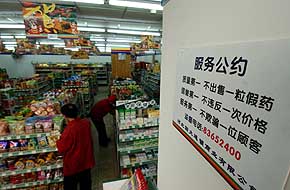 石家莊一家便利店內(nèi)張貼著“不出售一粒假藥”的承諾。本報記者 鞏志宏 攝