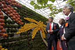 山東壽光是我國北方著名的“菜籃子”,目前全市優(yōu)質(zhì)蔬菜基地已達(dá)80萬畝,年產(chǎn)優(yōu)質(zhì)蔬菜40億公斤。在中國壽光國際蔬菜科技博覽會會上,三位外國參展商被用果蔬制成的藝術(shù)造型吸引。(本報資料照片) |
