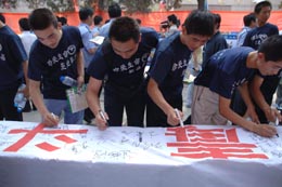 6月26日,山東省和濟(jì)南市禁毒委員會在濟(jì)南市濟(jì)南戰(zhàn)役紀(jì)念館廣場聯(lián)合舉辦“禁毒與健康”禁毒宣傳活動。活動通過展板、實物、案例介紹等形式引導(dǎo)群眾認(rèn)識吸毒的危害、遠(yuǎn)離毒品、樹立正確的健康理念。圖為參加“禁毒與健康”禁毒宣傳活動的濟(jì)南市民在禁毒宣傳橫幅上簽字。 新華社記者:徐速繪