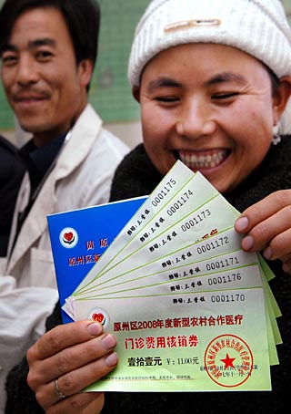 | 寧夏固原市原州區(qū)三營(yíng)鎮(zhèn)華坪梁村村民李國(guó)英,高興地領(lǐng)到了2008年度的新型農(nóng)村合作醫(yī)療門診費(fèi)用核銷券,解了“看病難”的憂。新華社記者