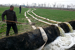 | 3月17日,河北省黃驊市西道安村組織村民抽取地表水澆灌受旱的小麥。今年河北省再次遇到嚴重春旱,目前,全省受旱耕地已達5000萬畝。傅新春