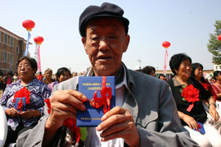 失地農(nóng)民拿到了政府為其辦理的醫(yī)療保險(xiǎn)。新華社記者:江威