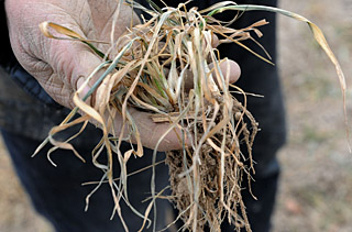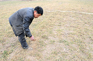 2月8日,連日陰霾之后,山東局部地區(qū)終于飄落一絲絲輕霧般的雨水。部分地區(qū)干渴的麥苗,仍見不到應有的綠意。 位于黃河下游南岸的高青縣青城鎮(zhèn)農(nóng)民于振亭正在自家麥田里劃鋤保墑!叭ツ赀@個時候地里濕乎乎的,拔一把麥苗能帶出泥來。你看今年這苗兒,根上干巴巴的,不掛土!边@位農(nóng)民告訴記者,目前在他所在的大于家村,個別地勢較高的地片已出現(xiàn)干葉死苗現(xiàn)象。眼看著立春已過,氣溫將不斷回升,大風天氣增多,要是再有半月不下雨,或者不澆地,就會出現(xiàn)大量死苗現(xiàn)象。