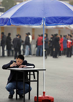 | 農(nóng)民工職介專場招聘會(huì)上,求職者在現(xiàn)場填寫表格。新華社記者 劉穎