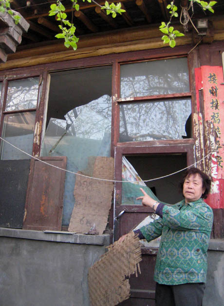 呼和浩特市玉泉區(qū)堿灘村93號(hào)居民馬彩欣指著自家破爛的門窗說(shuō),去年冬天以來(lái)有人一直威逼他們拆遷房屋,門窗玻璃經(jīng)常在深夜被人用石頭砸破。無(wú)奈之下,家人以席片、木板等阻擋,過(guò)著擔(dān)驚受怕的日子。本報(bào)記者 賈立君 攝