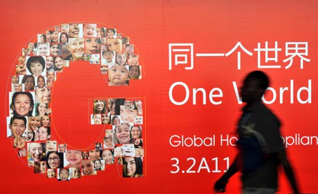 一位廣交會的客商經(jīng)過格蘭仕公司的廣告燈箱。本報記者 壯錦