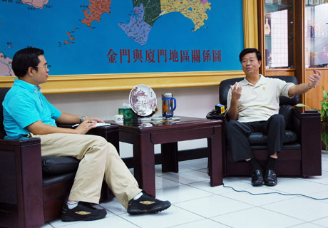 2008年10月8日,金門縣長(zhǎng)李炷烽(右)在金門接受赴臺(tái)駐點(diǎn)采訪的新華社、《人民日?qǐng)?bào)》記者采訪時(shí)表示:“金門應(yīng)變成兩岸合作發(fā)展的‘和平島’。雙方可合作在金門、廈門之間建設(shè)和平博物館。過(guò)去炮口相向,現(xiàn)在可把雙方原來(lái)的武器擺在一起,槍口、炮口都對(duì)著天,訴說(shuō)人類追求和平的決心!毙氯A社記者