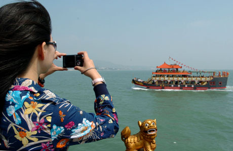2006年10月4日,游客在拍攝金廈海域“成功”號(hào)仿古游船!笆弧秉S金周期間,廈門市“游金廈海域,覽兩岸風(fēng)光”海上觀光項(xiàng)目每天都吸引了近萬(wàn)游人。游客乘上游船,廈門與金門兩岸風(fēng)光盡收眼底。新華社記者