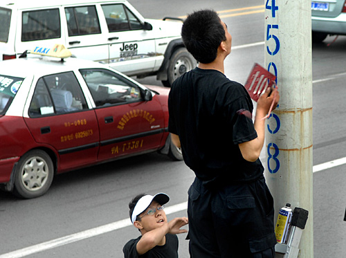 6月19日,工作人員在銀川市北京路一電線桿上噴涂編碼數(shù)字。銀川市警方將于近日啟動城市編碼報警求助系統(tǒng),對主要路段及建筑物進行數(shù)字對照編碼。警方可通過110報警者報出的數(shù)字,快速、準確地判斷其所處位置并出警。