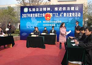 | 12月4日,第七個(gè)法制宣傳日,南京師范大學(xué)法學(xué)院學(xué)生在南京鼓樓廣場舉辦普法活動,現(xiàn)場咨詢、有獎問答、模擬法庭,吸引了市民廣泛參與。新華社記者 凌軍輝