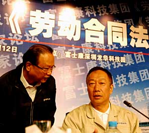 | 富士康科技集團(tuán)12日在深圳舉行《勞動(dòng)合同法》專題論壇,邀請(qǐng)勞動(dòng)部、國(guó)臺(tái)辦、全國(guó)總工會(huì)等相關(guān)部門的專家解答了企業(yè)和員工的疑問。富士康表示,將積極實(shí)施《勞動(dòng)合同法》,與數(shù)萬已連續(xù)工作8年以上的員工簽訂無固定期限勞動(dòng)合同。富士康科技集團(tuán)總裁郭臺(tái)銘(右者)在研討會(huì)上表示,富士康將積極實(shí)施《勞動(dòng)合同法》,全力推動(dòng)有富士康特色的勞動(dòng)合同制度,創(chuàng)造勞資雙贏、留住人才的局面,同時(shí)積極履行《勞動(dòng)合同法》規(guī)定的法律責(zé)任,做到合法經(jīng)營(yíng)。新華社記者
