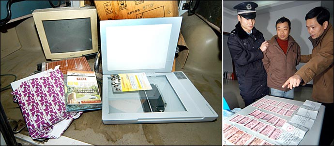 1月26日,犯罪團(tuán)伙主要犯罪嫌疑人(中)在指認(rèn)自己制作的假火車票。左圖為收繳的犯罪工具。 據(jù)了解,這個網(wǎng)絡(luò)制售假火車票犯罪團(tuán)伙制作了200張假票,通過網(wǎng)絡(luò)發(fā)布消息和粘貼小廣告等形式向外出售,假票面值達(dá)數(shù)萬元。