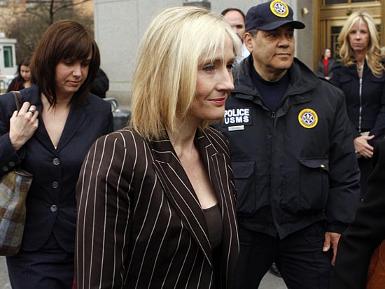 4月14日,在美國(guó)紐約,小說(shuō)《哈利·波特》作者J·K·羅琳(前)向法庭陳述后離開(kāi)。當(dāng)日,羅琳與一名美國(guó)“哈利·波特”迷對(duì)簿公堂。羅琳認(rèn)為,這名“粉絲”打算出版的《哈利·波特詞典》侵犯了她的知識(shí)產(chǎn)權(quán)。新華社/路透