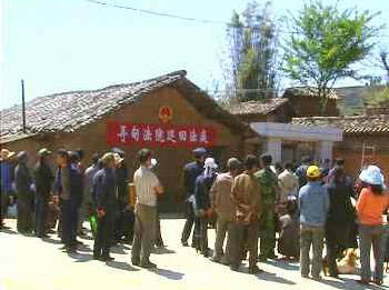 10日,在云南省尋甸回族彝族自治縣大水塘村,縣法院在村子的一片空地上,掛起了莊嚴(yán)的國徽,多名法警在現(xiàn)場維持著秩序,一名審判長、一名書記員、加上原告和被告以及雙方辯護(hù)人,組成了一個在基層農(nóng)村開庭的巡回法庭。