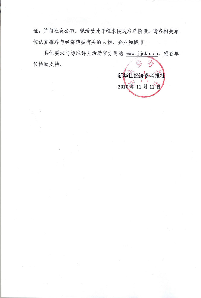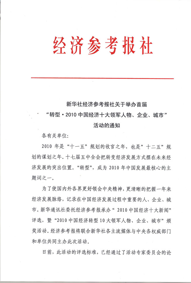 首屆“轉型2010中國經濟十大領軍人物、企業(yè)、城市”活動通知