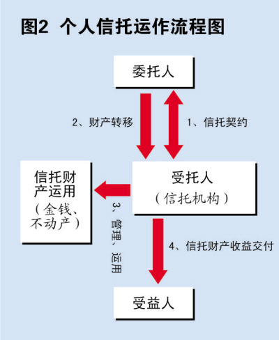 個(gè)人信托是委托人(指自然人)為了財(cái)產(chǎn)規(guī)劃之目的,將其財(cái)產(chǎn)權(quán)移轉(zhuǎn)予受托人,使受托人依信托契約闡明的宗旨,為受益人的利益或特定目的,管理或處分信托財(cái)產(chǎn)的一種資產(chǎn)管理行為。(見圖2)