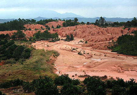 稀土開(kāi)發(fā)留下的尾砂山 在江西省信豐縣水土保持教育基地,因稀土開(kāi)發(fā)留下的寸草不長(zhǎng)的尾砂山和周圍綠意蔥蘢的橙園形成對(duì)比(10月24日攝)。上世紀(jì)80年代,這里的稀土礦區(qū)新增水土流失面積24.68平方公里,排放尾砂近6000萬(wàn)噸,尾砂山成了“江南沙漠”! ∮浾