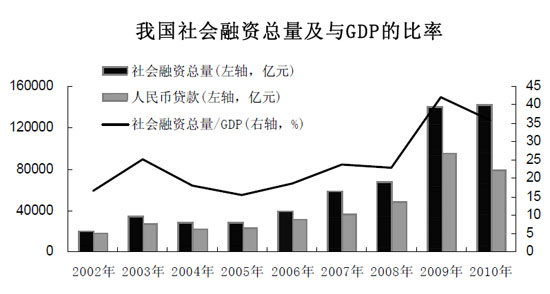 統(tǒng)計(jì)數(shù)據(jù)顯示,我國(guó)社會(huì)融資總量快速擴(kuò)張,金融對(duì)經(jīng)濟(jì)的支持力度明顯加大。從2002年到2010年,我國(guó)社會(huì)融資總量由2萬億元擴(kuò)大到14.27萬億元,年均增長(zhǎng)27.8%,比同期人民幣各項(xiàng)貸款年均增速高9.4個(gè)百分點(diǎn)。2010年社會(huì)融資總量與GDP之比為35.9%,比2002年提高19.2個(gè)百分點(diǎn)。金融體系對(duì)實(shí)體經(jīng)濟(jì)的支持力度明顯加大(見圖)。社會(huì)融資總量快速增長(zhǎng)的同時(shí),金融結(jié)構(gòu)也多元化發(fā)展,金融對(duì)資源配置的積極作用不斷提高。一是2010年企業(yè)債融資、非金融企業(yè)股票融資和保險(xiǎn)公司賠償分別占同期社會(huì)融資總量的8.4%、4.1%和1.3%,其中企業(yè)債融資比2002年上升6.8個(gè)百分點(diǎn)。二是商業(yè)銀行表外業(yè)務(wù)融資功能顯著增強(qiáng)。2010年銀行承兌匯票、委托貸款和信托貸款分別占同期社會(huì)融資總量16.3%、7.9%和2.7%,分別比2002年高19.8、7和2.7個(gè)百分點(diǎn)。