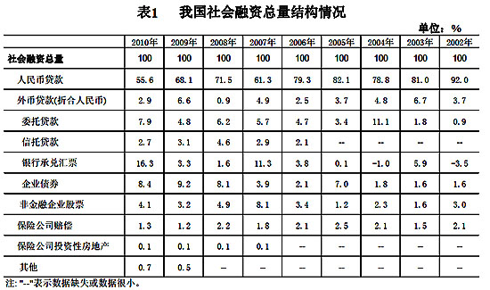 貨幣政策的最終目標(biāo)是促進(jìn)經(jīng)濟(jì)增長(zhǎng)、實(shí)現(xiàn)充分就業(yè)、保持物價(jià)穩(wěn)定和維持國(guó)際收支平衡。為了實(shí)現(xiàn)這一最終目標(biāo),一般都要根據(jù)一個(gè)國(guó)家的實(shí)際情況,確定合適的中間目標(biāo)。較長(zhǎng)時(shí)期以來,我國(guó)貨幣政策重點(diǎn)監(jiān)測(cè)、分析的指標(biāo)和調(diào)控中間目標(biāo)是M2和新增人民幣貸款。在某些年份,新增人民幣貸款甚至比M2受到更多關(guān)注。然而由于新增人民幣貸款已不能準(zhǔn)確反映實(shí)體經(jīng)濟(jì)的融資總量,因此只有將商業(yè)銀行表外業(yè)務(wù)、非銀行金融機(jī)構(gòu)提供的資金和直接融資都納入統(tǒng)計(jì)范疇,才能完整、全面監(jiān)測(cè)和分析整體社會(huì)融資狀況,也才能從根本上避免因過度關(guān)注貸款規(guī)模而形成的“按下葫蘆浮起瓢”的現(xiàn)象,即商業(yè)銀行通過表外業(yè)務(wù)繞開貸款規(guī)模。這些表外業(yè)務(wù)主要有銀行承兌匯票、委托貸款、信托貸款等。以2010年為例,全年新增人民幣貸款7.95萬億元,同比少增1.65萬億元,但是實(shí)體經(jīng)濟(jì)通過銀行承兌匯票和委托貸款從金融體系新增融資達(dá)3.47萬億元,占社會(huì)融資總量的24.2%,同比多增2.33萬億元(見表1)。