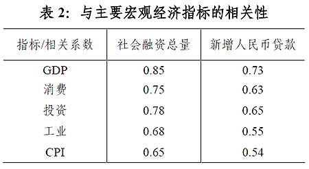 衡量一個(gè)指標(biāo)能否作為調(diào)控的中間目標(biāo),有兩個(gè)重要標(biāo)準(zhǔn),一是它與最終目標(biāo)的關(guān)聯(lián)性,二是它的可調(diào)控性。實(shí)證分析表明,與新增人民幣貸款相比,社會(huì)融資總量與主要經(jīng)濟(jì)指標(biāo)相互關(guān)系更緊密。衡量?jī)蓚(gè)變量之間的關(guān)系,在統(tǒng)計(jì)上一般采用相關(guān)性分析,測(cè)算得到的相關(guān)系數(shù)絕對(duì)值一般在0與1之間。相關(guān)系數(shù)越高,說明兩個(gè)變量之間的關(guān)系越緊密。我們采用基于2002-2010年的月度和季度數(shù)據(jù),對(duì)社會(huì)融資總量、新增人民幣貸款與主要經(jīng)濟(jì)指標(biāo)分別進(jìn)行統(tǒng)計(jì)分析(見表2),結(jié)果表明:與新增人民幣貸款相比,我國(guó)社會(huì)融資總量與GDP、社會(huì)消費(fèi)品零售總額、城鎮(zhèn)固定資產(chǎn)投資、工業(yè)增加值、CPI的關(guān)系更緊密,相關(guān)性顯著優(yōu)于新增人民幣貸款。